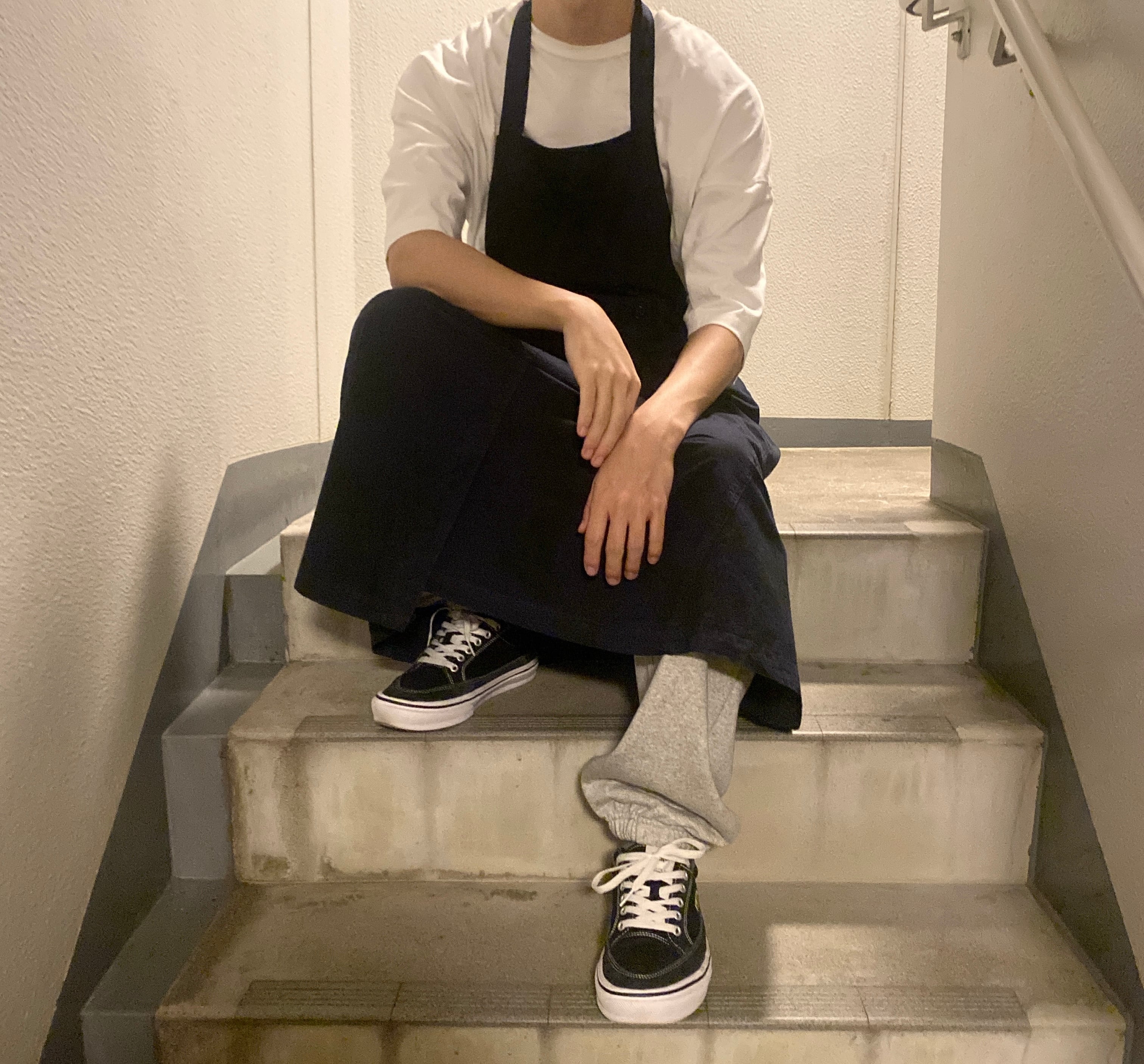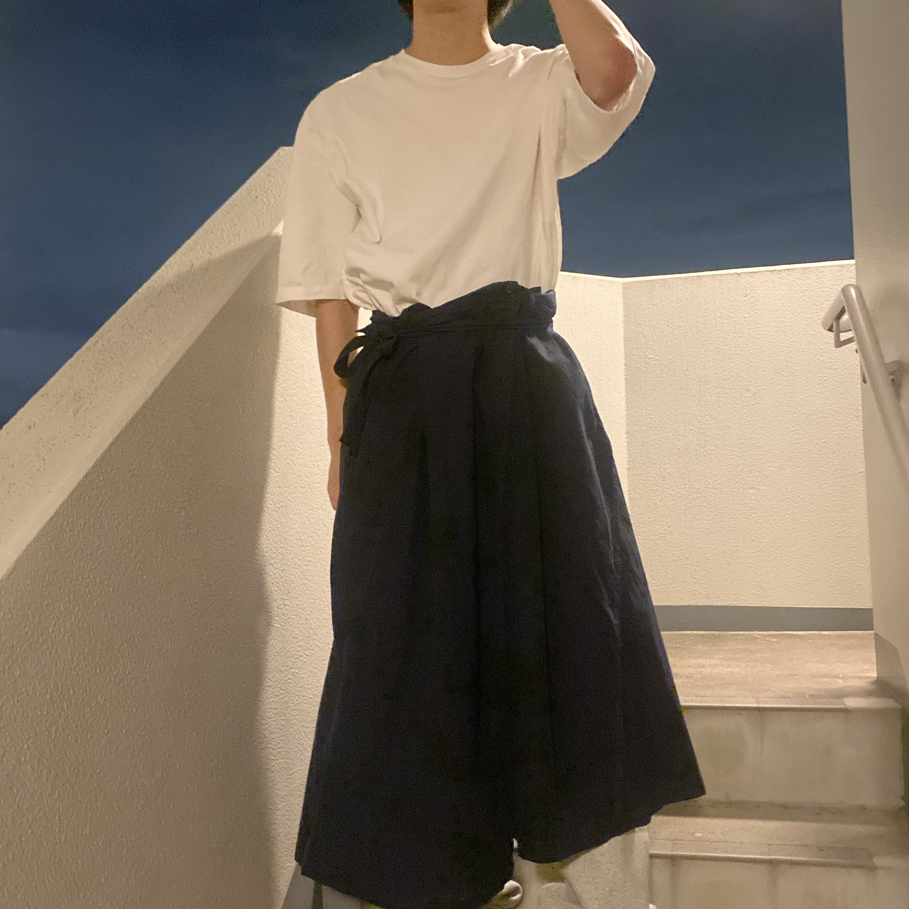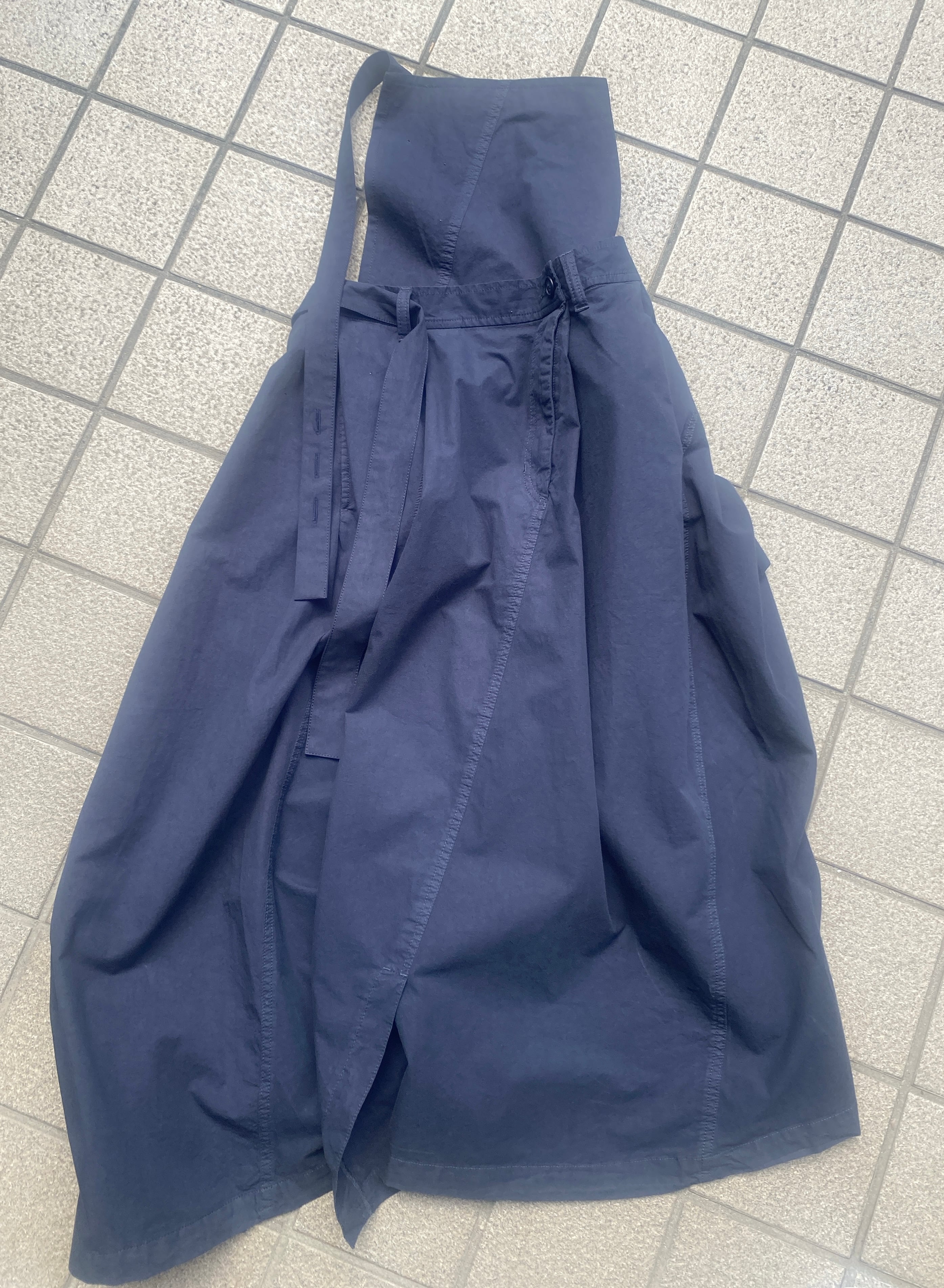 【2WAY apron skirt】 イタリヤの生地メーカーから取り寄せた生地を使用した製品染めのスカートを2枚潰してリユースした2WAYのエプロンスカート。 カジュアルにラップスカートとしては勿論、贅沢にエプロンやサロンとしても使えます。 color NAVY size Free